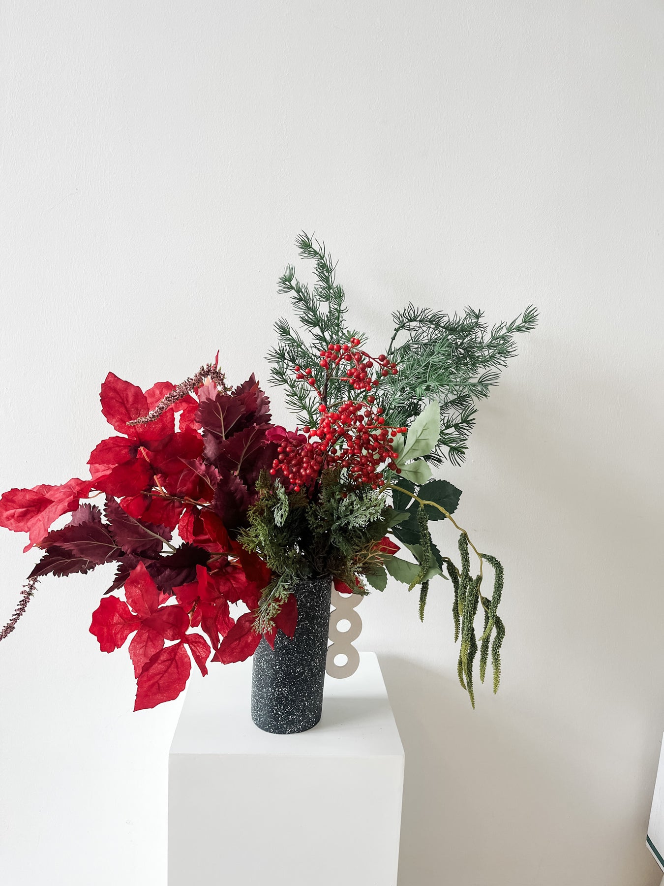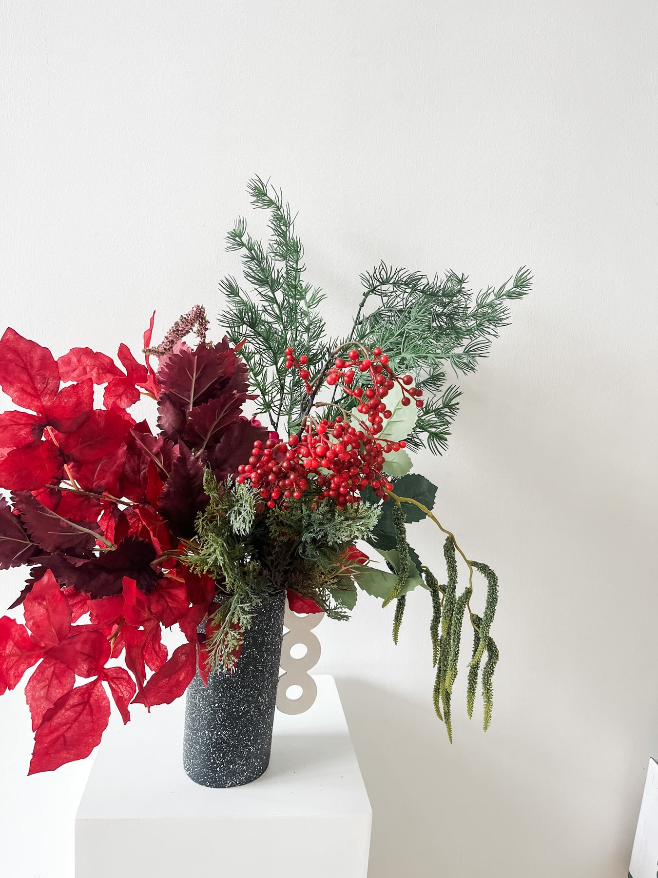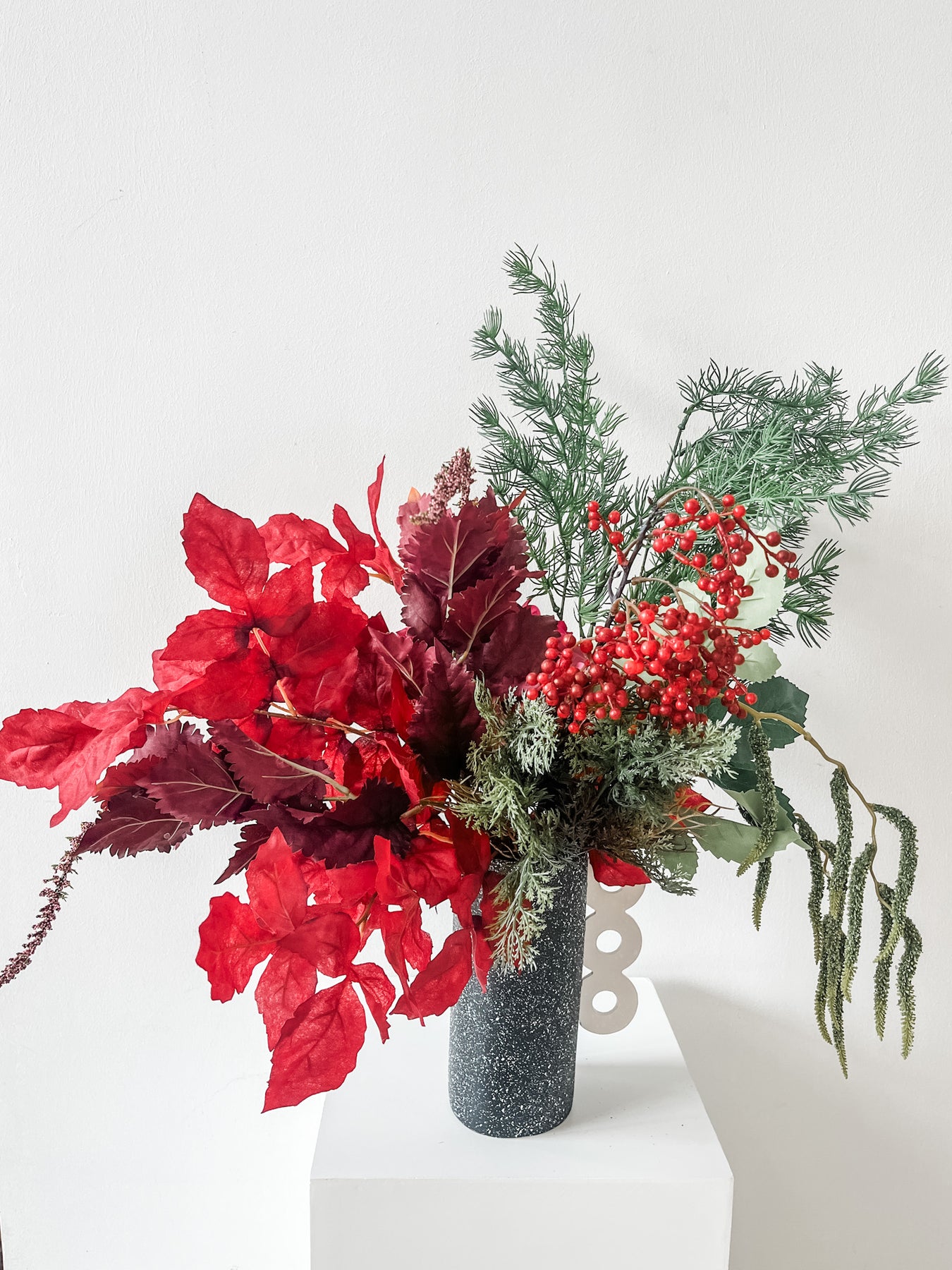 A unique display of hanging Amaranthus with the realistic Christmas pine and cypress. The classic Christmas colours makes the most eye-catching ornament in your home decor and elevates the festive mood. It also makes a luxurious Christmas gift for a special friend or family.