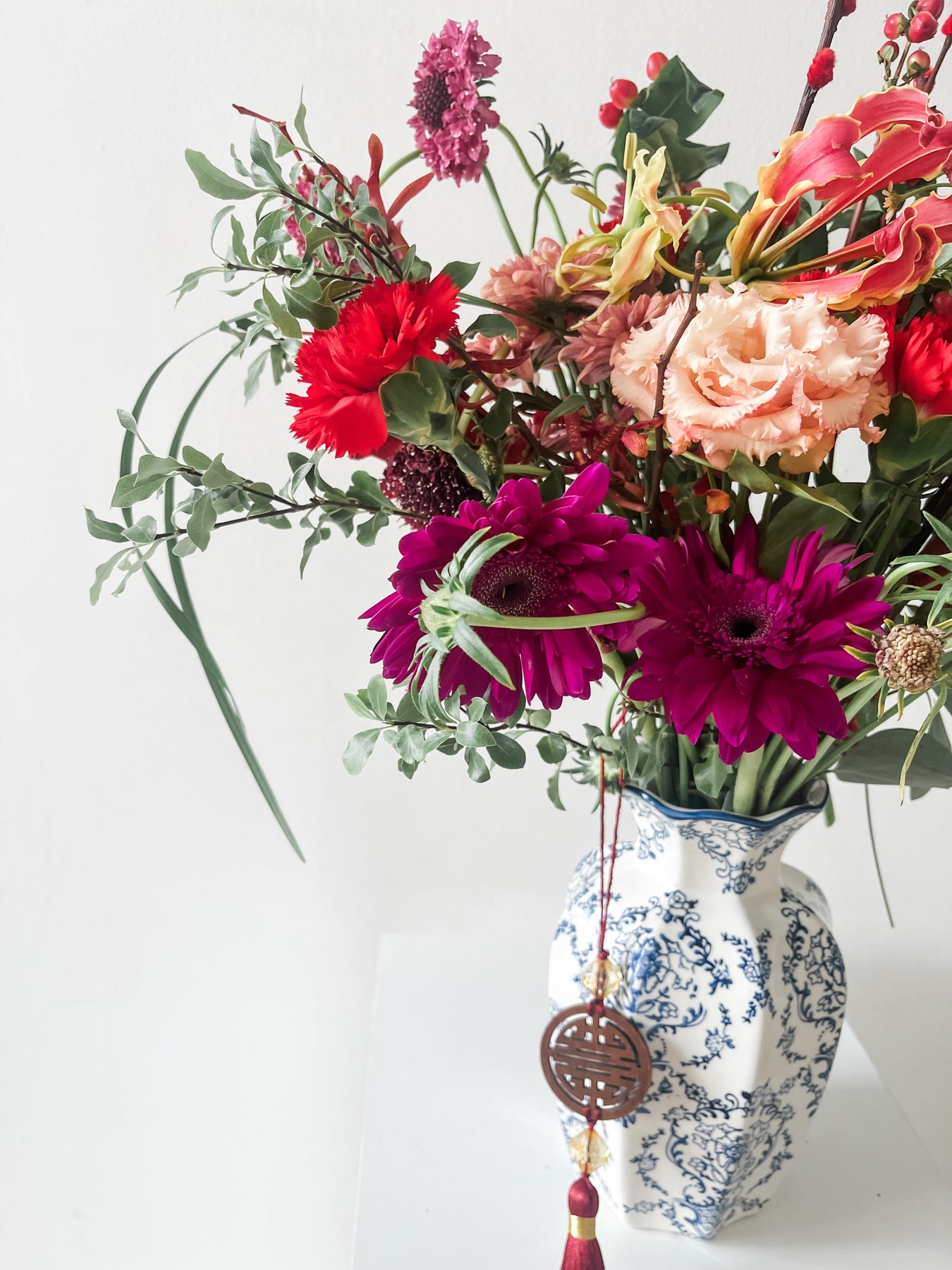 The beauty of this porcelain vase lies in its oriental charm. Adorn your festive table with this fresh arrangement, with seasonal blooms and burst of colours.