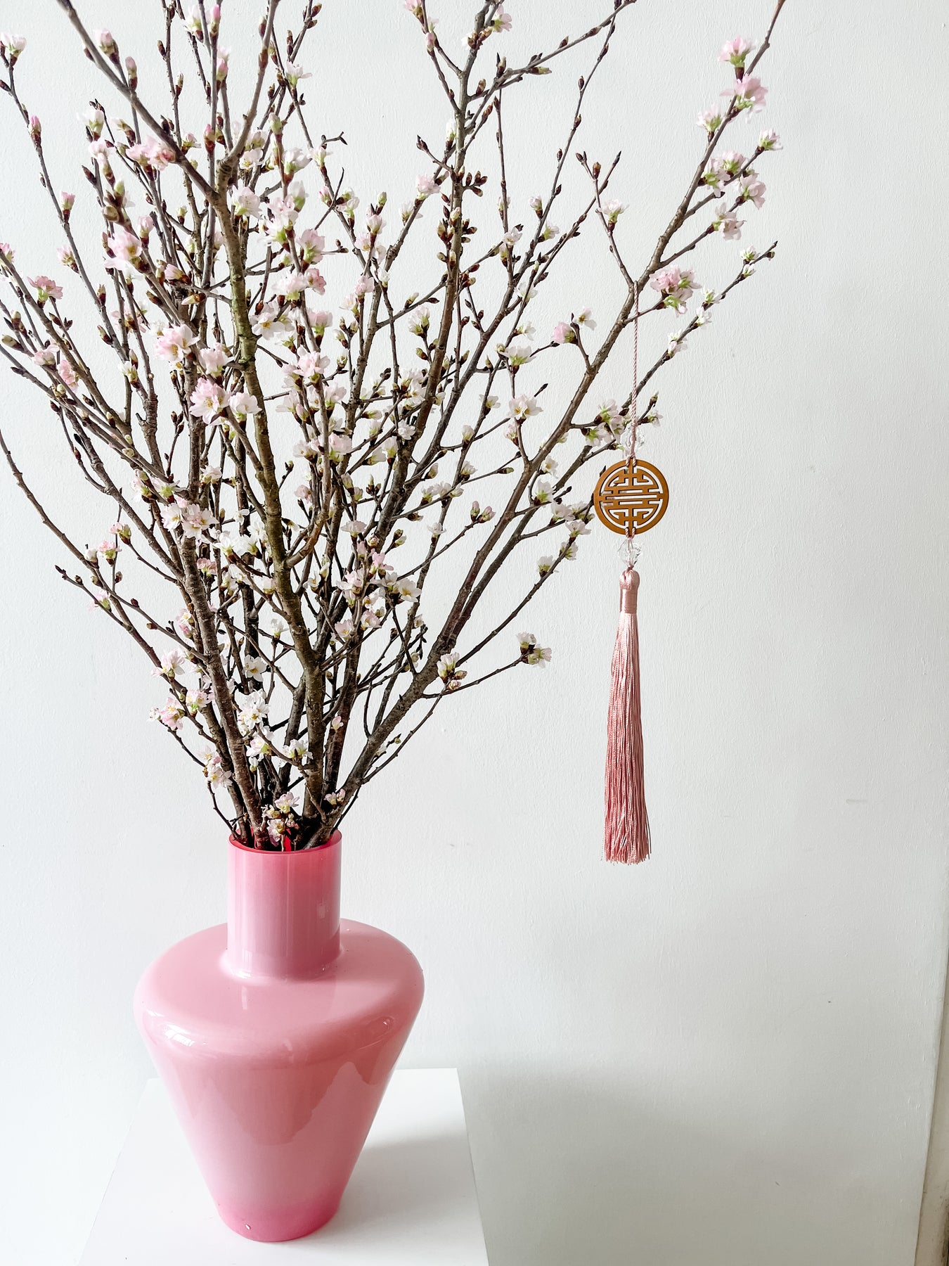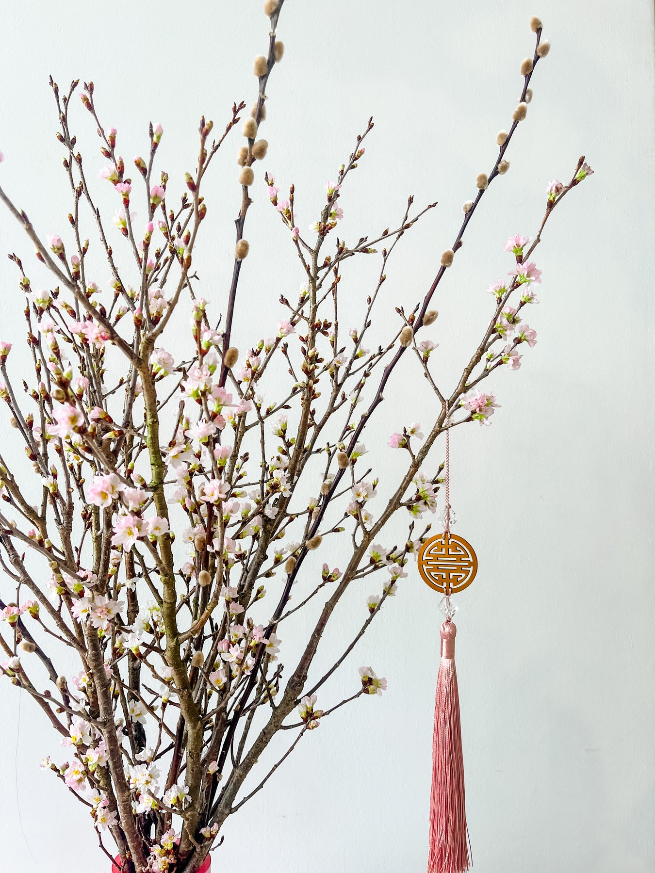 The arrival of springtime is marked by the blooming of the delicate Sakura blossoms and you can enjoy this Sakura pink blooms right in your home! These Keio Sakura buds are imported from Japan and will last for 1-2 weeks for your hosting and celebrations! The vase arrangements will come with accompanying pussy willows and Chinese knot for your full floral display at the heart of your festivities.